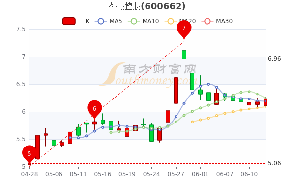 6月14日消息,外服控股开盘报价6.11元,收盘于6.23元。5日内股价上涨0.16%,总市值为141.79亿元。