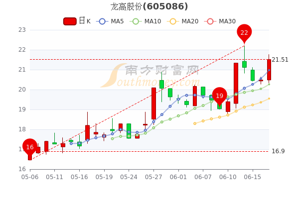 6月17日收盘消息,龙高股份开盘报价20.48元,收盘于21.51元。7日内股价上涨11.53%,总市值为27.53亿元。