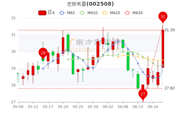 6月20日消息,老板电器最新报31.29元,涨8.76%。成交量28.62万手,总市值为296.95亿元。
