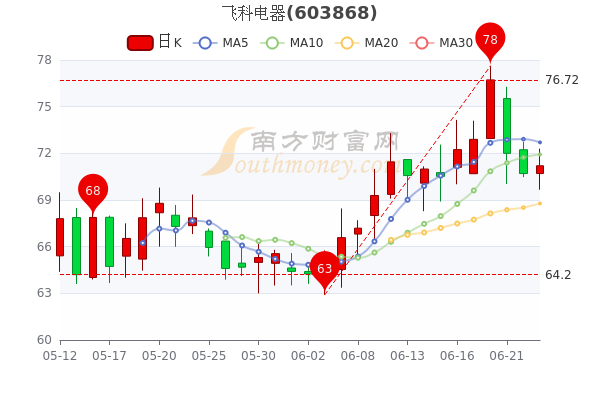 6月23日消息,飞科电器7日内股价上涨0.96%,截至15点收盘,该股报71.38元,涨0.96%,总市值为310.15亿元。