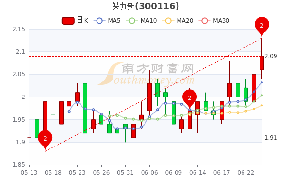 6月24日收盘最新消息,保力新5日内股价上涨2.87%,截至15时,该股报2.09元涨1.95% 。