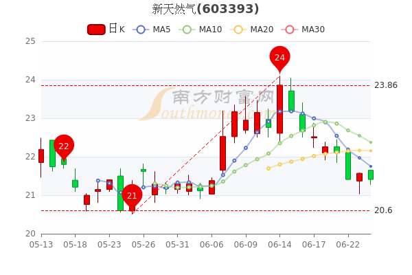 6月24日新天然气开盘报价21.65元,收盘于21.41元,跌0.74%。当日最高价为21.65元,最低达21.27元,成交量4.9万手,总市值为90.76亿元。