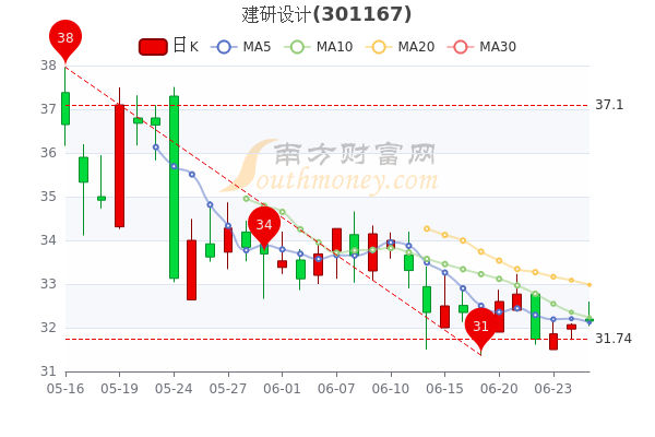 6月27日盘中消息,建研设计7日内股价下跌0.87%,最新涨0.25%,报32.15元,换手率3.68%。