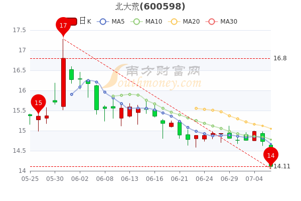 7月6日消息,北大荒最新报14.11元,跌4.21%。成交量31.27万手,总市值为250.83亿元。