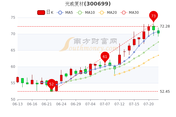 7月22日消息,光威复材开盘报价71元,收盘于70.21元,跌1.39%。当日最高价71.93元,最低达69.18元,总市值363.93亿。