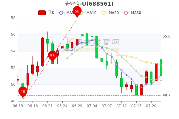 7月22日奇安信-U(688561)开盘报53元,截至15点收盘,该股报51.09元跌2.83%,成交1.22亿元,换手率0.52%。