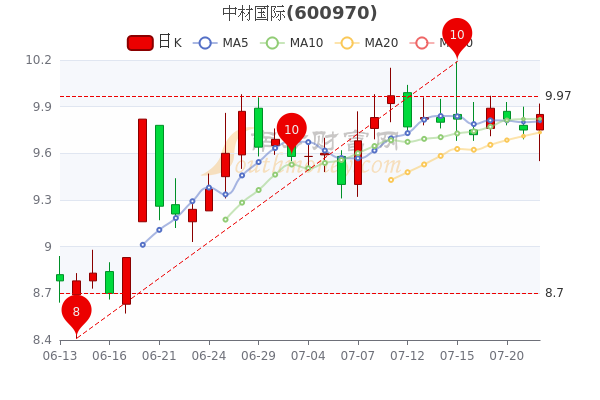 7月22日中材国际(600970)开盘报9.75元,截至15点,该股报9.85元涨1.03%,成交2.19亿元,换手率1.29%。
