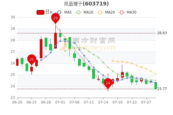 7月29日良品铺子开盘报价24.35元,收盘于23.77元,跌2.34%。当日最高价为24.36元,最低达23.71元,成交量1.88万手,总市值为95.32亿元。