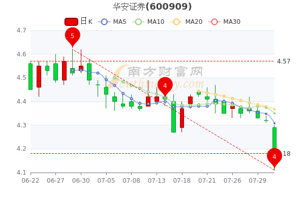华安证券(600909)跌3.24%,报4.18元,成交额1.45亿元,换手率0.74%,振幅-3.241%。