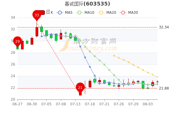 8月5日收盘消息,嘉诚国际开盘报23元,截至15点收盘,该股涨0.44%,报23.04元,总市值为53.74亿元,PE为19.36。