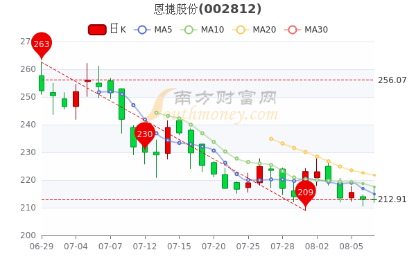 8月9日恩捷股份开盘报价213.03元,收盘于212.91元,跌0.05%。当日最高价为217.5元,最低达211.8元,成交量4.25万手,总市值为1900.03亿元。