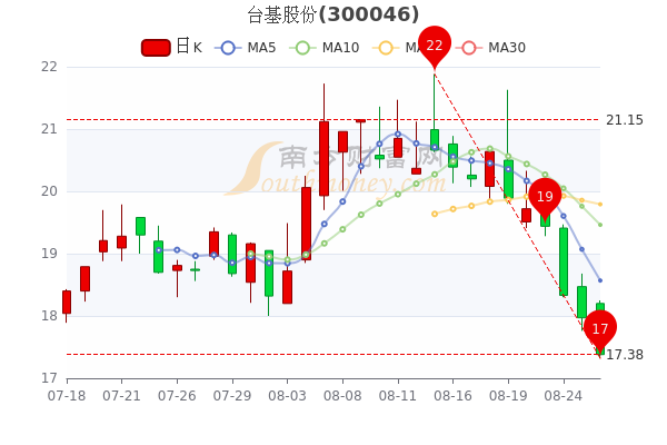8月26日台基股份(300046)开盘报18.2元,截至15点,该股报17.38元跌3.28%,成交1.19亿元,换手率2.83%。