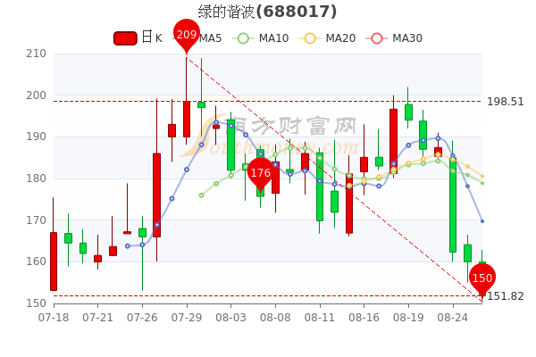 8月26日收盘消息,绿的谐波5日内股价下跌23.18%,截至下午3点收盘,该股报151.82元,跌5.11%,总市值为255.94亿元。
