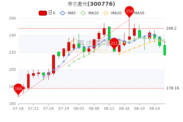 8月26日收盘消息,帝尔激光5日内股价下跌8.89%,今年来涨幅下跌-15%,最新报217元,跌4.82%,市盈率为60.28。