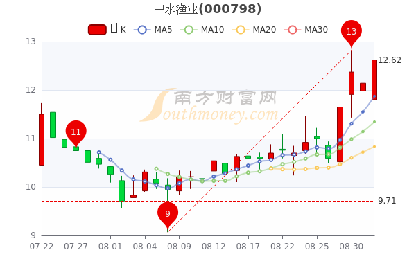 9月1日中水渔业开盘报价11.8元,收盘于12.44元,涨2.47%。当日最高价为12.62元,最低达11.78元,成交量26.06万手,总市值为46.17亿元。