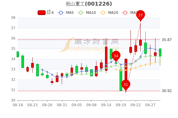 9月29日盘后消息,拓山重工最新报34.12元,成交量1.6万手,总市值为25.58亿元。