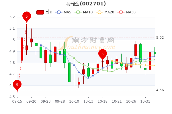 11月2日盘中消息,奥瑞金7日内股价上涨2.45%,最新跌0.2%,报4.880元,换手率0.24%。