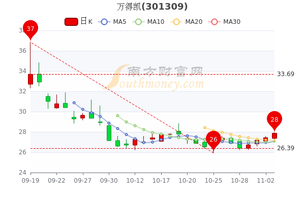 11月3日万得凯(301309)开盘报27.36元,截至15点收盘,该股报27.880元涨0.18%,成交5748.26万元,换手率8.76%。