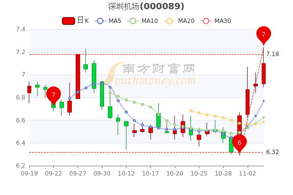 11月4日消息,深圳机场开盘报价6.92元,收盘于7.100元,涨2.6%。当日最高价7.24元,市盈率-422.62。