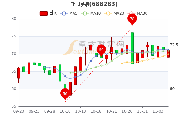 11月7日消息,坤恒顺维5日内股价下跌2.18%,最新报70.950元,成交量67.39万手,总市值为59.6亿元。