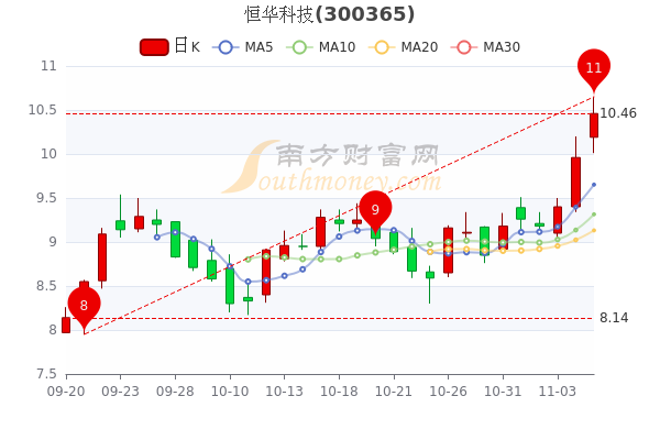 11月7日恒华科技(300365)开盘报10.19元,截至下午三点收盘,该股报10.460元涨5.02%,成交3.65亿元,换手率8.07%。