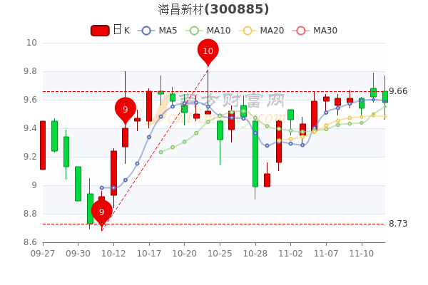 11月14日消息,海昌新材开盘报价9.66元,收盘于9.580元,涨0.1%。当日最高价9.77元,市盈率17.26。