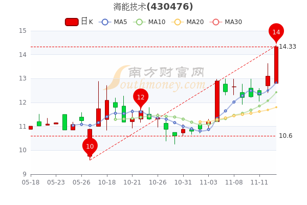 11月15日消息,海能技术7日内股价上涨11.26%,最新报14.030元,市盈率为18.71。