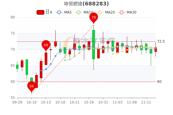 11月15日晚间复盘消息,坤恒顺维5日内股价下跌0.79%,今年来涨幅上涨46.87%,最新报70.640元,成交额3420.78万元。