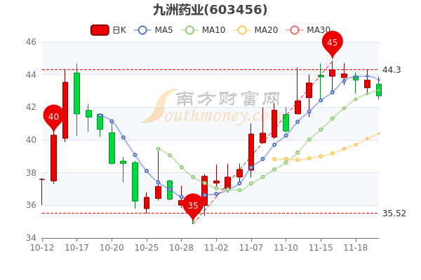 九洲药业最新报价42.700元,7日内股价下跌1.85%;今年来涨幅下跌-19.56%,市盈率为55.46。