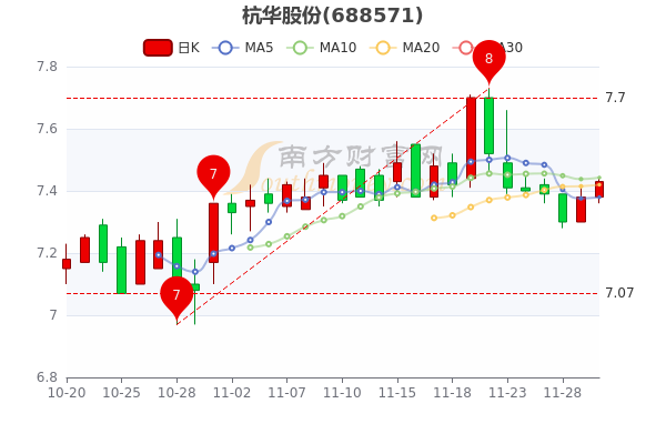11月30日早盘消息,杭华股份7日内股价下跌4.34%,最新涨0.68%,报7.400元,换手率0.03%。