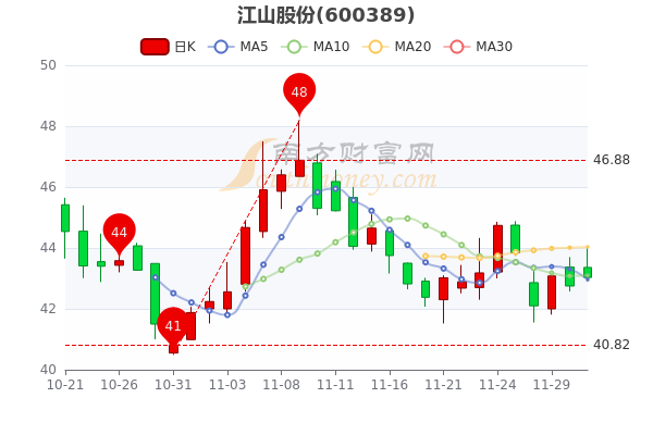 12月1日江山股份(600389)开盘报43.36元,截至收盘,该股报43.030元涨0.8%,成交1.19亿元,换手率0.92%。