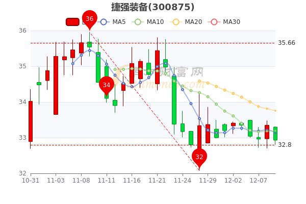 12月9日,捷强装备开盘报价33.3元,收盘于32.930元,跌1.26%。当日最高价为33.31元,最低达32.8元,成交量69.13万手,总市值为32.88亿元。