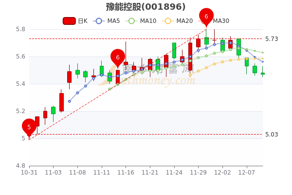 12月9日消息,豫能控股开盘报价5.48元,收盘于5.470元,跌0.18%。当日最高价5.53元,最低达5.45元,总市值83.46亿。