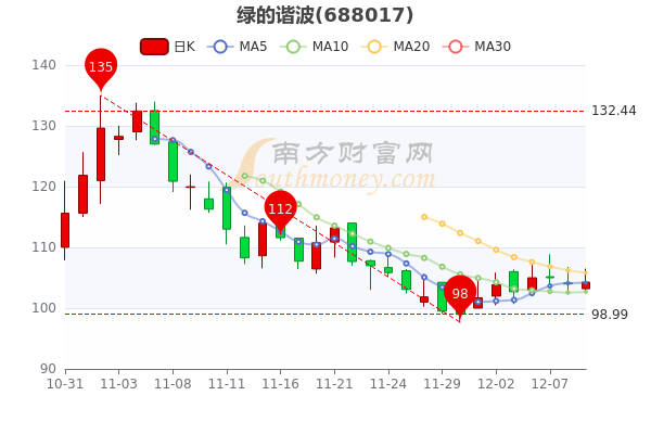 12月9日消息,绿的谐波开盘报103.2元,截至下午三点收盘,该股涨0.27%,报104.280元。当前市值175.8亿。