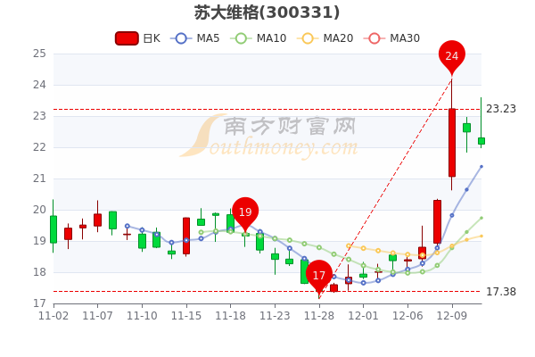 12月13日苏大维格开盘报价22.3元,收盘于22.100元,跌1.73%。当日最高价为23.6元,最低达21.97元,成交量1734.37万手,总市值为57.39亿元。
