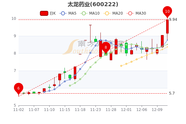 12月13日盘后消息,太龙药业7日内股价上涨14.89%,最新涨9.96%,报9.940元,换手率22.57%。