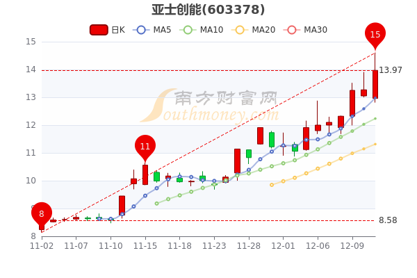 12月13日盘后消息,亚士创能最新报价13.970元,3日内股价上涨5.15%,市盈率为-7.59。