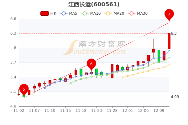 12月13日消息,江西长运开盘报价5.98元,收盘于6.300元。3日内股价上涨9.52%,总市值为17.92亿元。