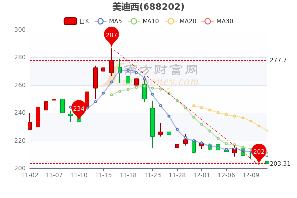 12月13日盘后消息,美迪西7日内股价下跌4.77%,最新跌0.62%,报203.310元,换手率1.23%。