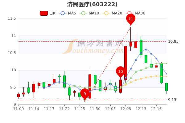 12月20日消息,济民医疗开盘报9.63元,截至15点收盘,该股跌2.39%,报9.400元。换手率1.85%,振幅跌2.39%。