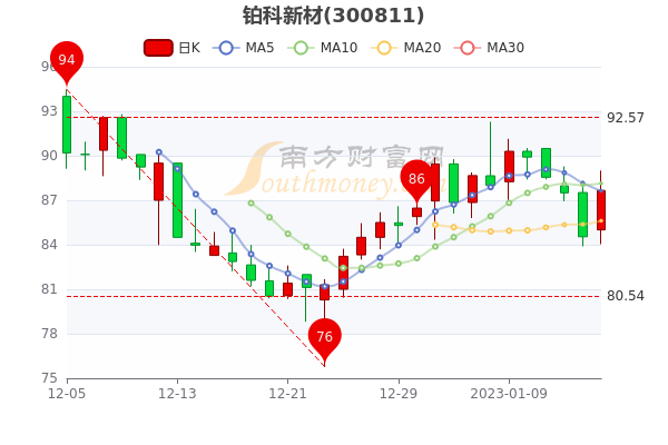1月16日消息,铂科新材7日内股价下跌0.39%,截至15点,该股报87.660元,涨3.69%,总市值为96.3亿元。