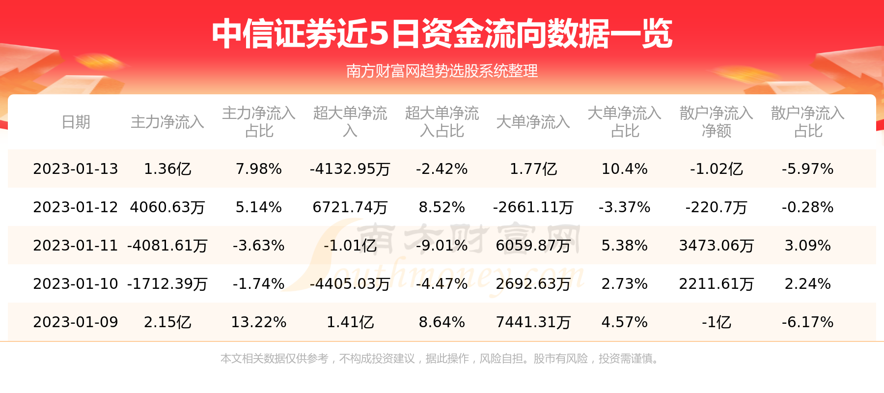 1月13日消息,中信证券资金净流入1.36亿元,超大单资金净流出4132.95万元,换手率1.84%,成交金额21.47亿元。