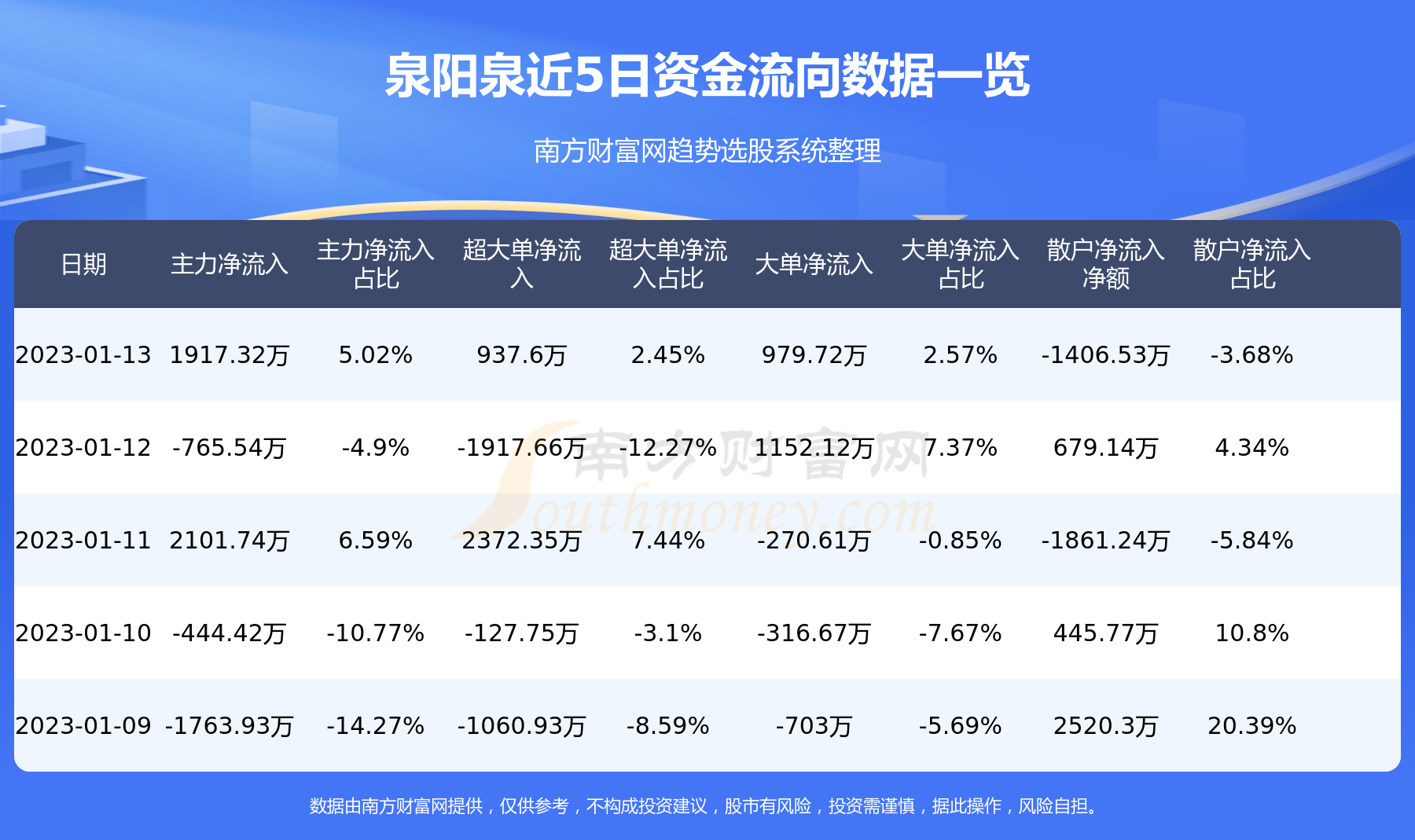 1月13日消息,泉阳泉1月13日主力净流入1917.32万元,超大单净流入937.6万元,大单净流入979.72万元,散户净流出1406.53万元。