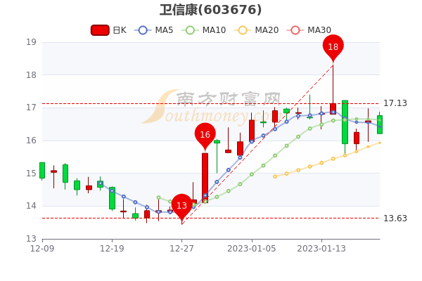 卫信康开盘价报16.76元,现跌2.35%,总市值为70.54亿元;截止发稿,成交额6181.92万元。