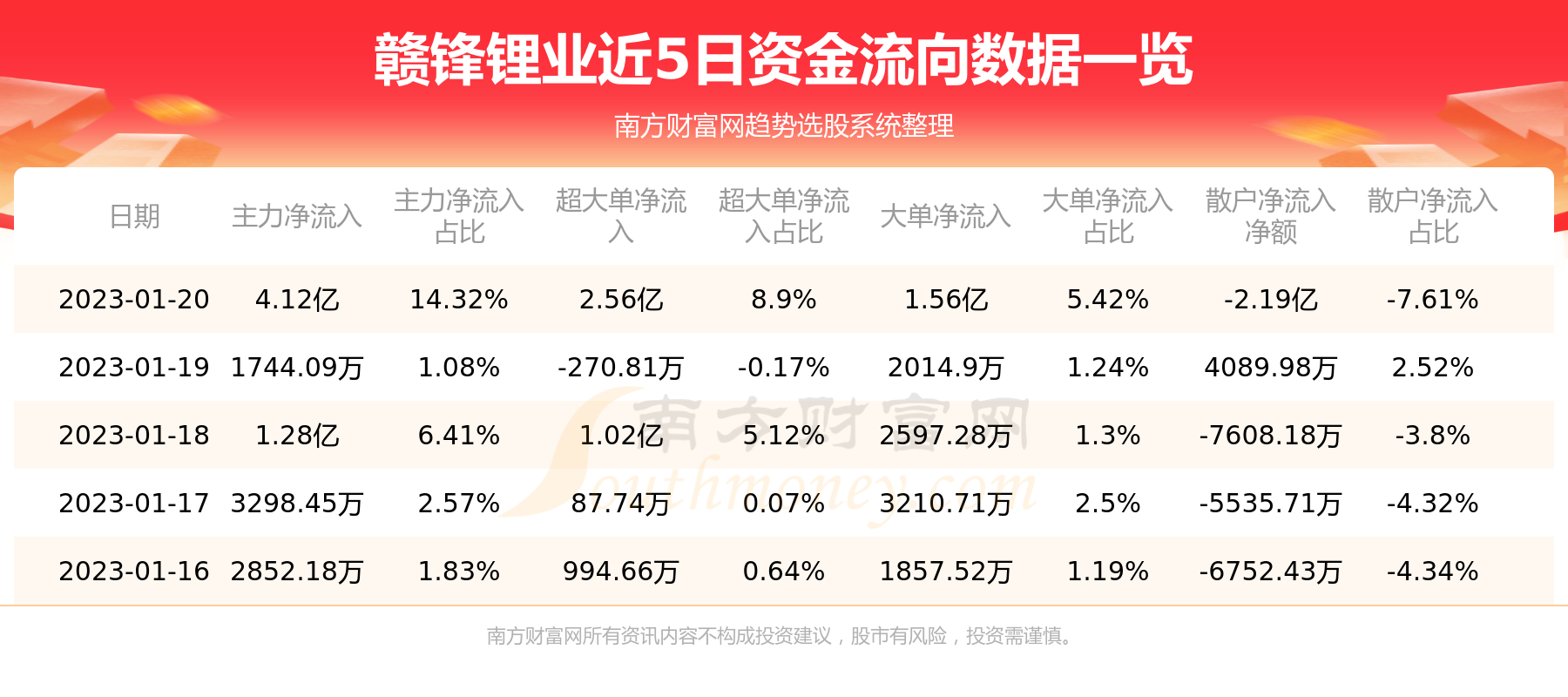 1月20日消息,赣锋锂业主力净流入4.12亿元,超大单净流入2.56亿元,散户净流出2.19亿元。