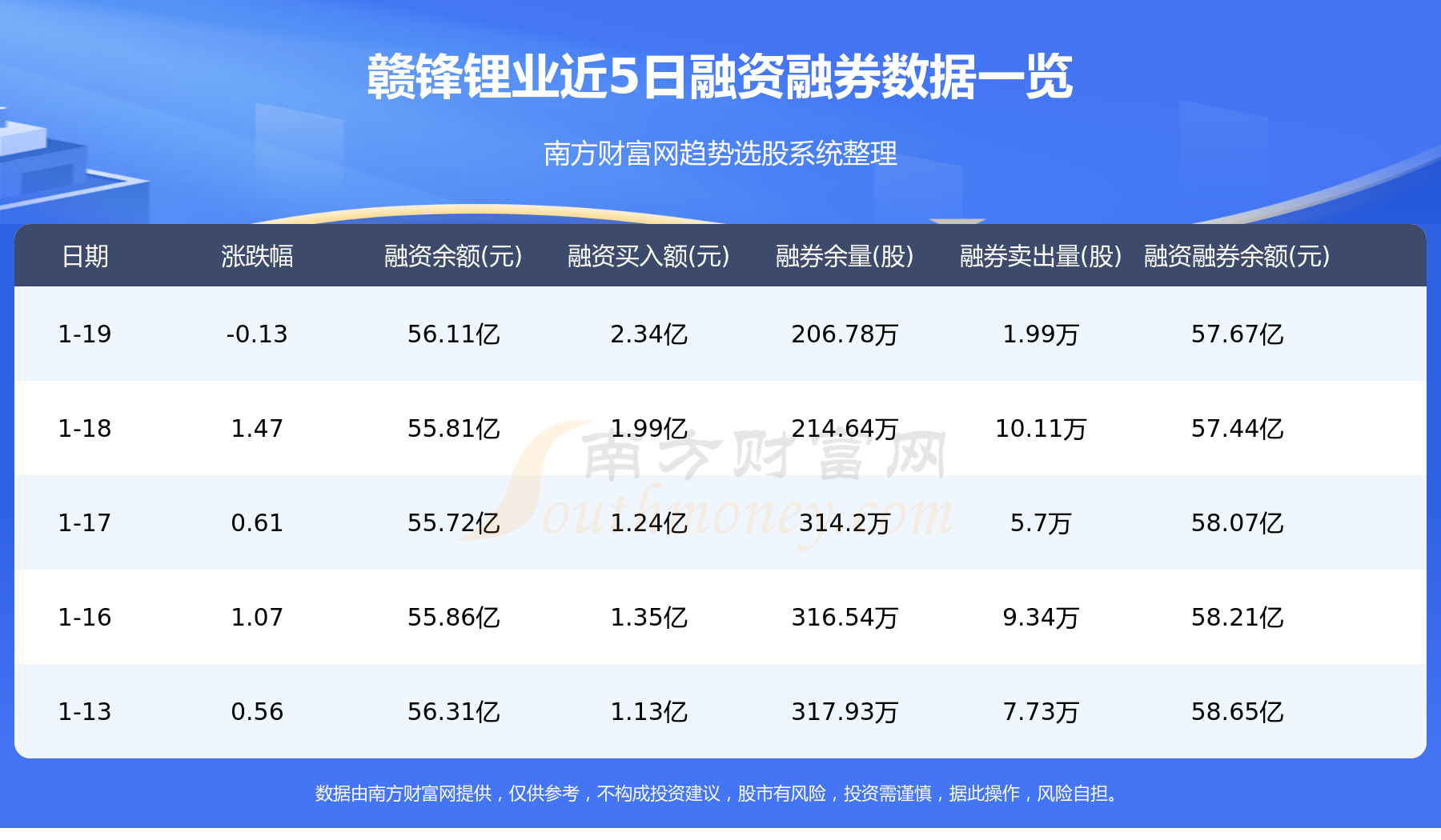 赣锋锂业1月19日融券信息显示,融资方面,当日融资买入2.34亿元,融资偿还2.05亿元,融资净买额2965.53万元。融券方面,融券卖出1.99万股,融券偿还9.85万股,融券余量206.78万股,融券余额1.57亿元。融资融券余额57.67亿元。近5日融资融券数据一览见下表:
