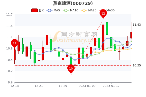 1月31日盘后消息,燕京啤酒最新报11.240元,涨1.73%。成交量3649.33万手,总市值为316.8亿元。