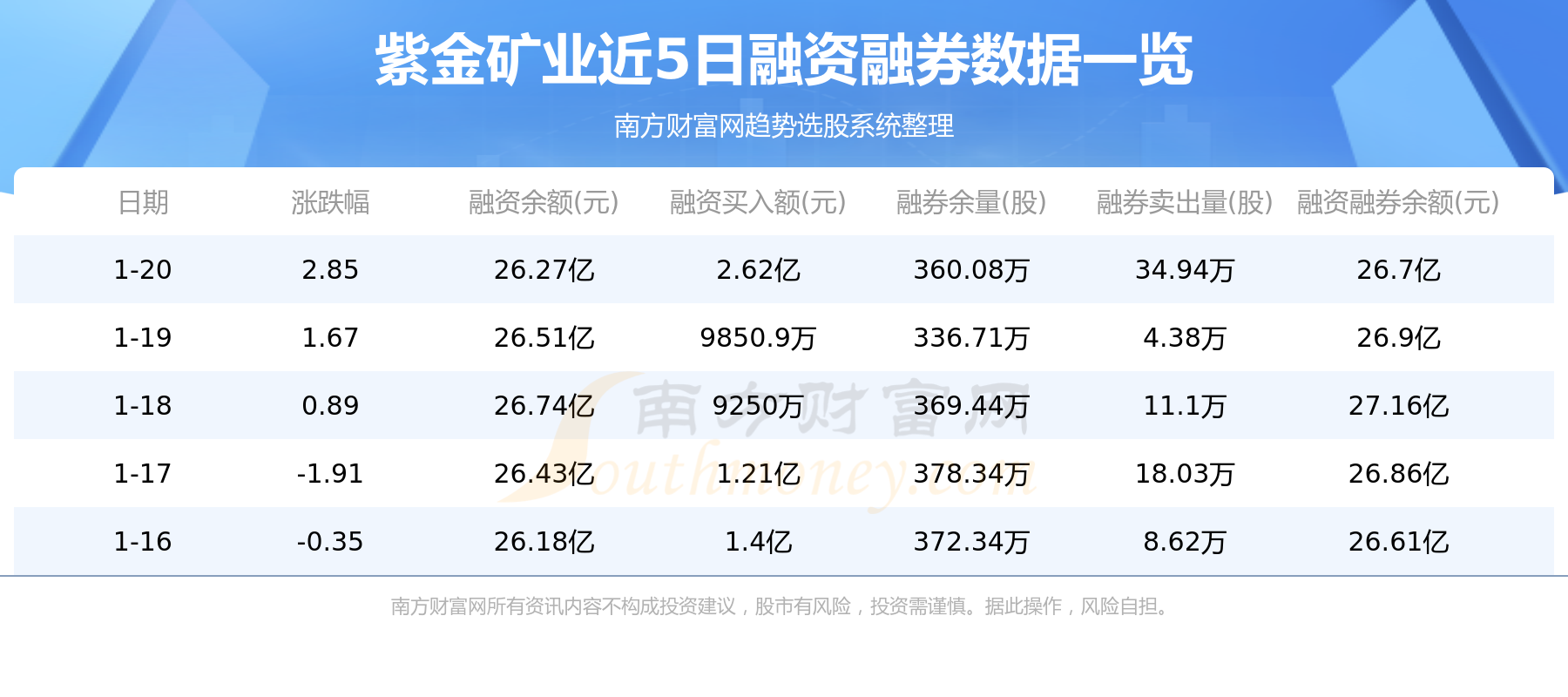 1月20日紫金矿业融券信息显示,融资方面,当日融资买入2.62亿元,融资偿还2.86亿元,融资净买额-2401.02万元。融券方面,融券卖出34.94万股,融券偿还11.57万股,融券余量360.08万股,融券余额4288.57万元。融资融券余额26.7亿元。近5日融资融券数据一览见下表: