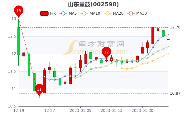 2月6日山东章鼓开盘报价12.4元,收盘于12.410元,跌0.8%。当日最高价为12.54元,最低达12.31元,成交量724.02万手,总市值为38.72亿元。