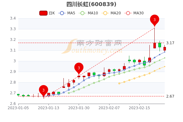 2月22日盘后消息,四川长虹开盘报价3.1元,收盘于3.130元。5日内股价上涨5.43%,总市值为144.49亿元。